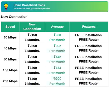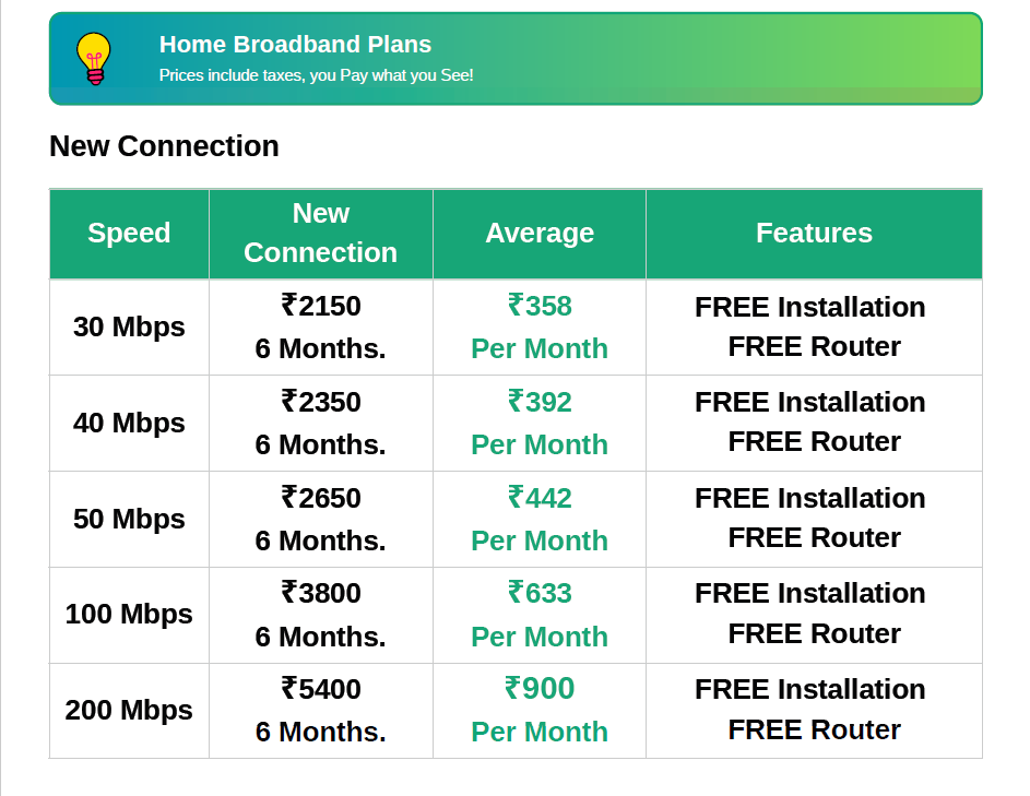 Pay ₹2500 with GST for 6 months, average cost per Month - ₹417 for 40 Mbps speed and unlimited data with free installation and free router for use.