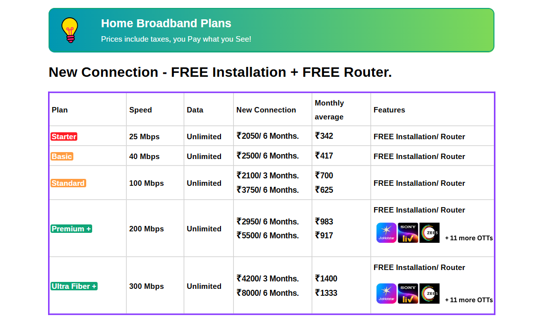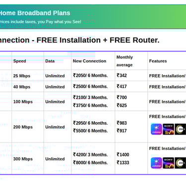 Pay ₹2500 with GST for 6 months, average cost per Month - ₹417 for 40 Mbps speed and unlimited data with free installation and free router for use.